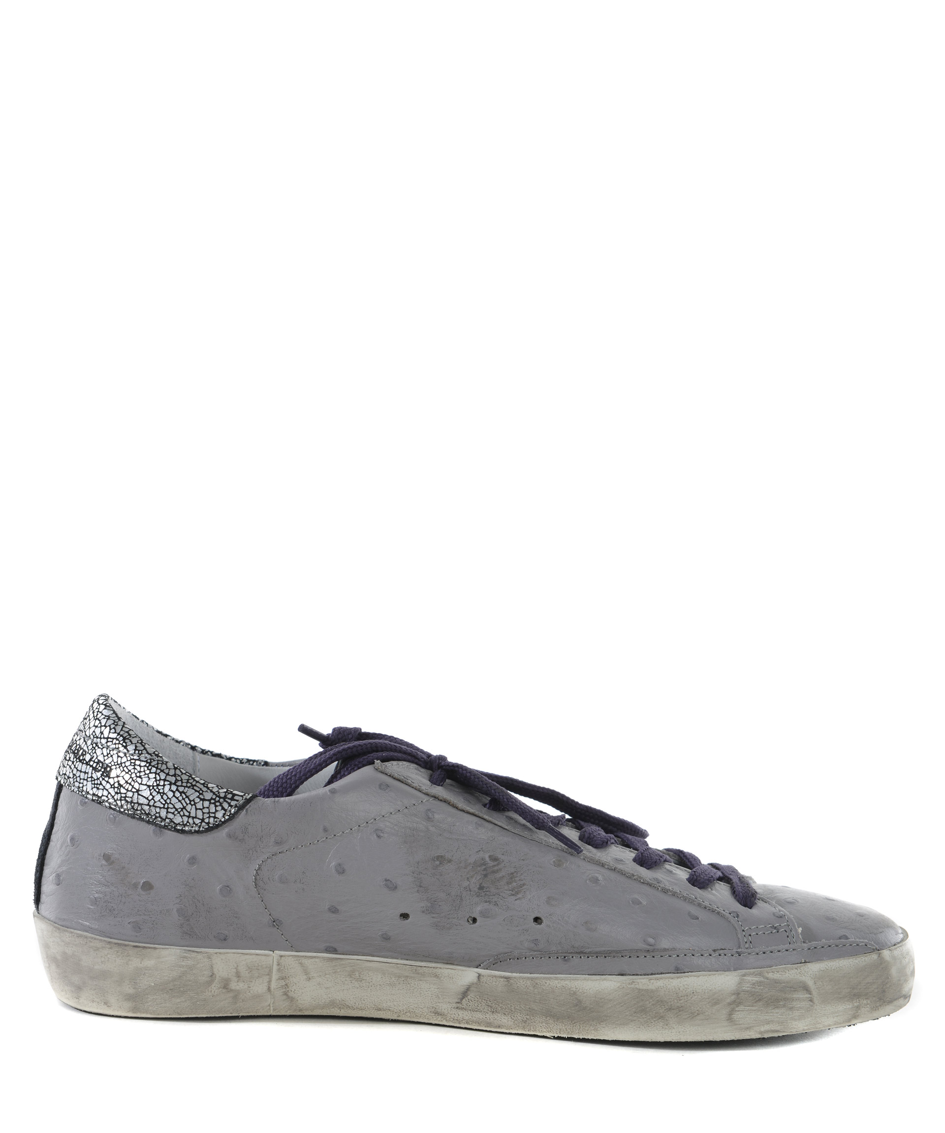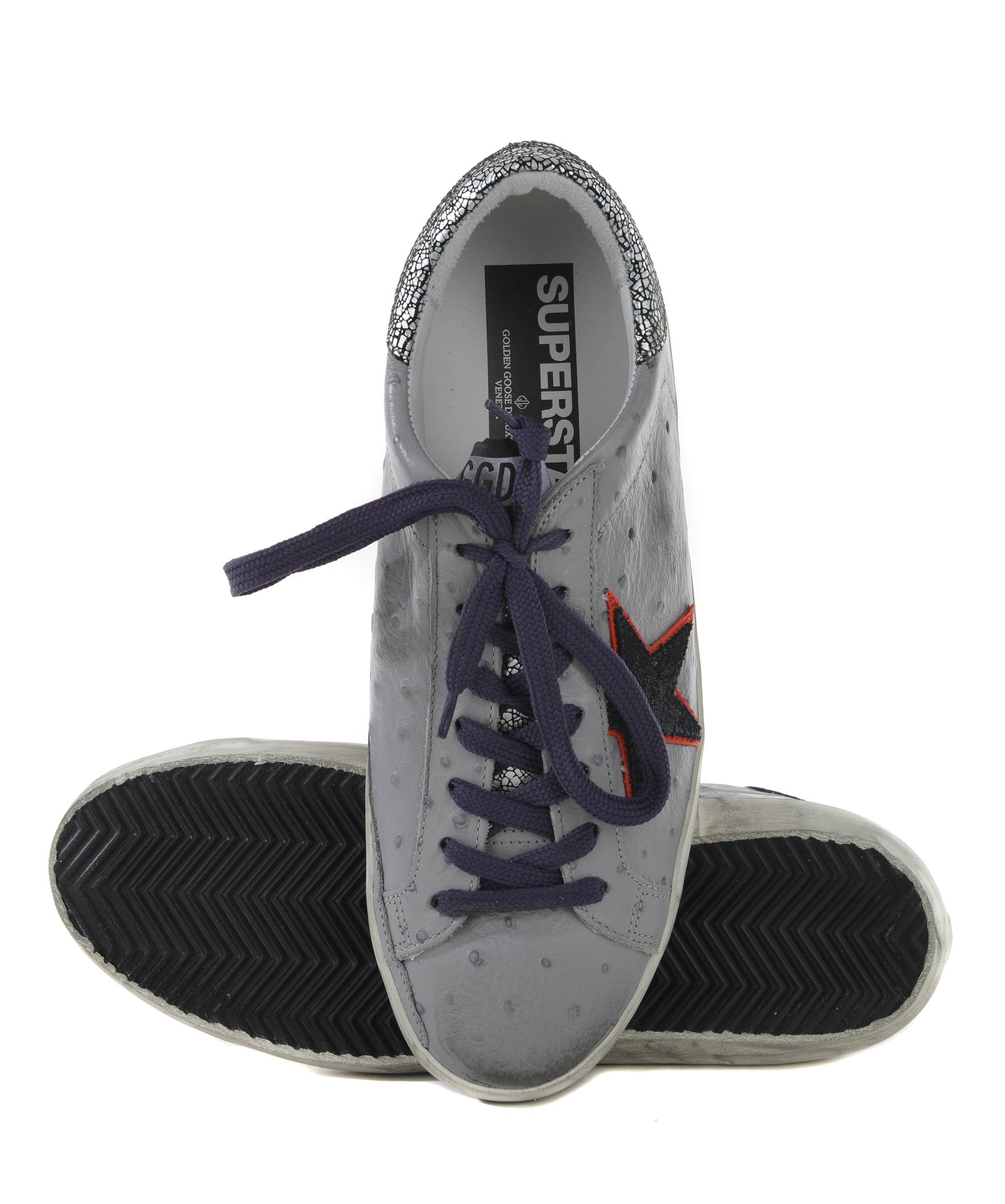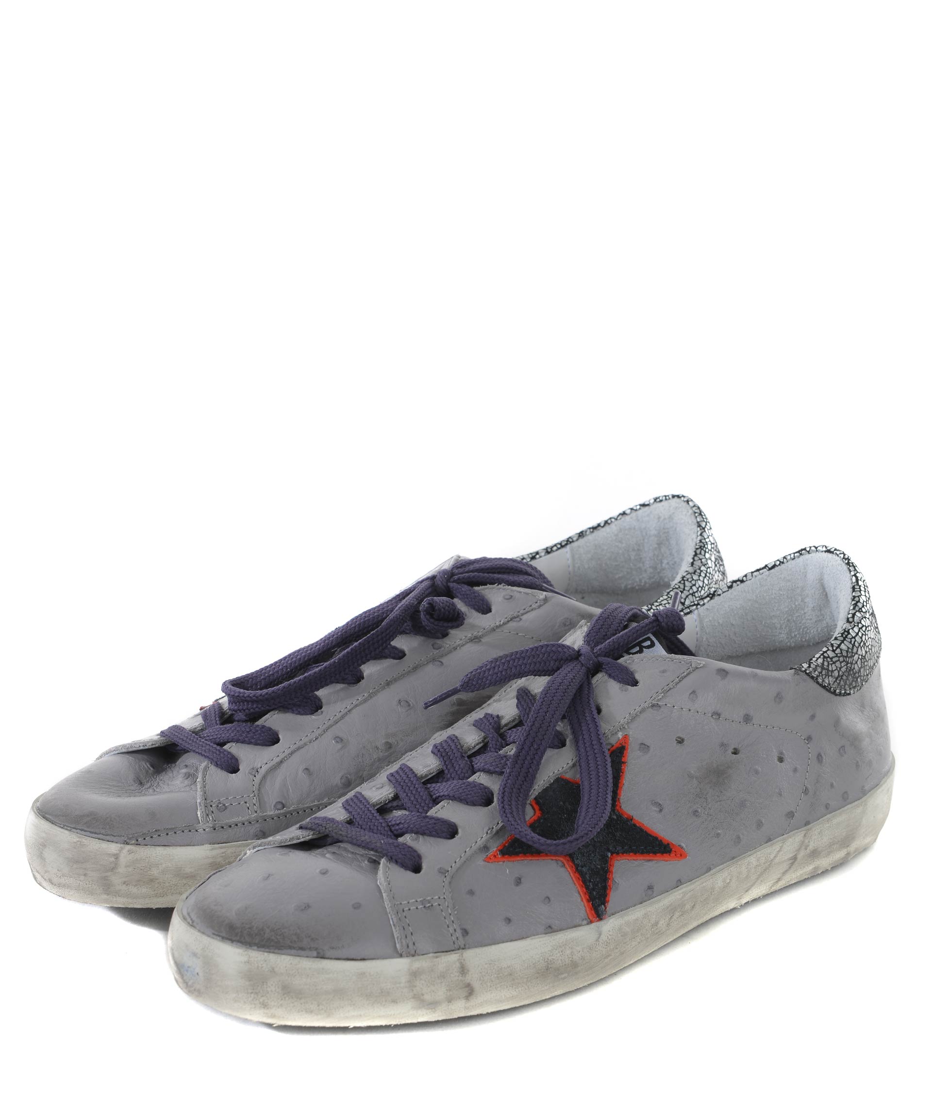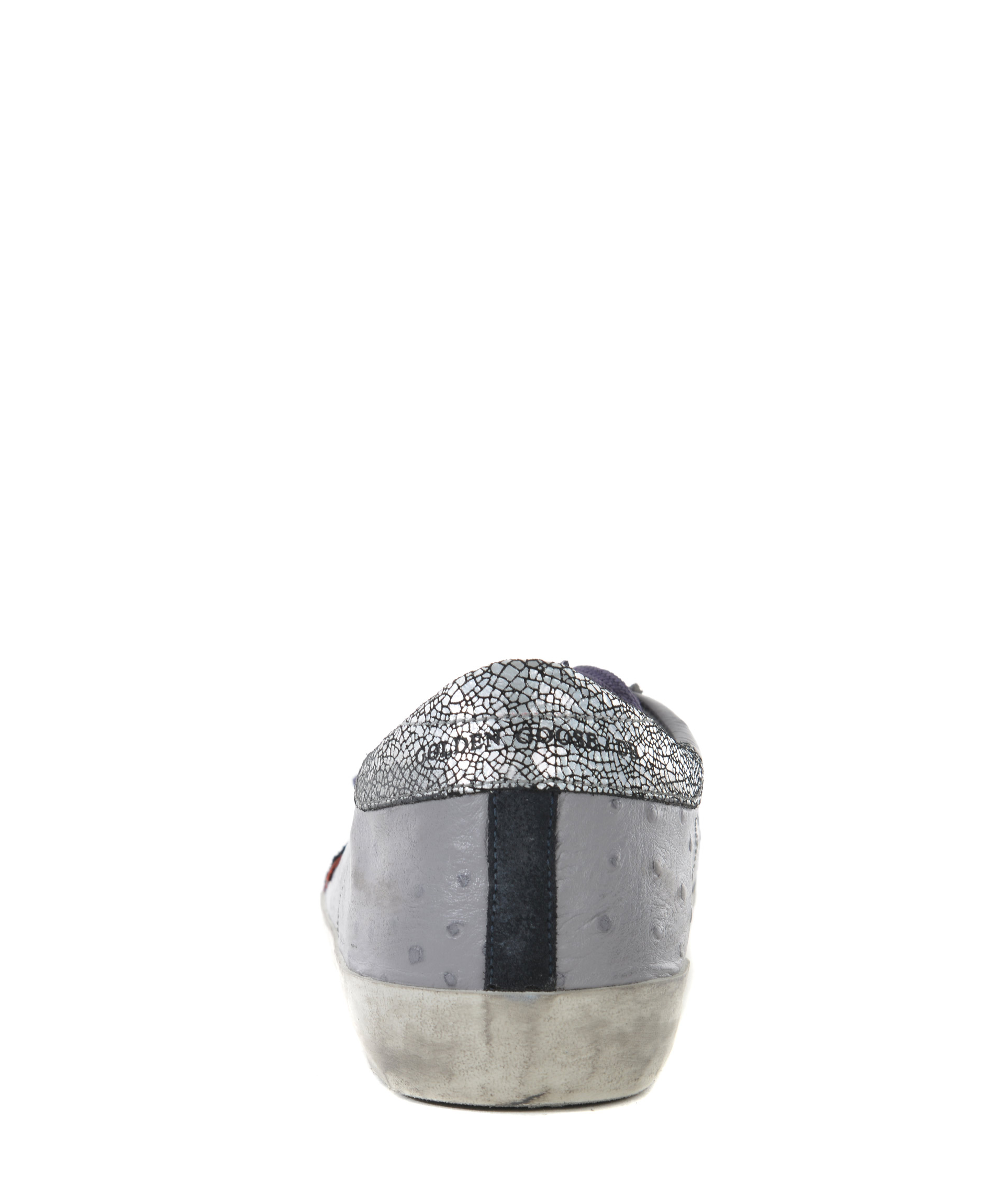 Sneakers Golden Goose in pelle stampa struzzo Grigio. Effetto used. Inserto a contrasto sul retro. Stella laterale in camoscio blu e rosso. Stringhe a contrasto. Patch logo sulla linguetta. Suola in gomma effetto used. Misura in foto 40