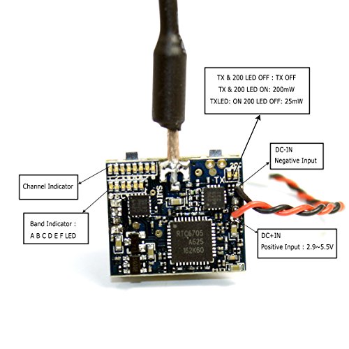 작업 온도 범위: - 10x2103?; ~+ 60x2103?; RaceBand : 5362?~ 5945mhz 채널: 48 변조타입: FM 채널 스위치에 의해SEL : 송신 파워: 14?± 1dbm & 23?± 1dbm 주파수 제어: PLL 모두 조화: MAX는- 50dbm 주파수 안정 도: ± 100khz ( Typ.) 주파수의 정밀도: ± 200khz ( Typ.) 채널 캐리어 에러: ± 1db 안테나 포토 저항: 50?& # x3?a9?; 입력 포맷: NTSC / PAL 유효 픽셀: PAL : 720?x 540?/ NTSC : 640?x 480?1?/ 4?'' MAX를 참조해 하십시오.프레임 레이트: NTSC : 50fieds / sec PAL : 60?fieds /초천사와 같은 렌즈H : 120도/ V : 100?° NTSC / PALflip:조작:푸쉬SW버튼 TX온/오프& # xff08?; RF유효 무효 조작 xff09?; : SW버튼을 누르기 CH SEL )가 표시됩니다./주파수/전원SEL.SW버튼을 누르기 소비전력: 25?mw-max280ma xff0?C ; 200mw-max550ma @ 5?V DC 공급 전압2.9?V5.5?V 치수20?* 17?mm 안테나:특별 다이 폴 윕 안테나 중량: 5그램 스테이터스 indicator가 있습니다.ch1ch8그린LED채널 indicator; A ~ F블루LED주파수 그룹 indicator; TX온/오프가 빨간 indicator; 25?mW / 200mw그린 indicator sw1키 버튼 기능: 1로 구성되어 있습니다. 의 키를 누르기 채로로 하면,2??5s,「밴드A부터 F,스텝을 다음부터 어느(있는) 밴드.2로 구성되어 있습니다. 쇼트의 키를 누르기2 초이하,채널 업 메뉴ch1ch8,스텝부터 다음에 채널 존재 3.키를 누르기 채로 510 초사이 눌러 25?mW선택하는지 200?mW 4.10초에 설정 되고 굽히고, 이상의 키를 누르기 채로로 하면,선택 스위치의 TX sw2키 버튼 기능: 1로 구성되어 있습니다. 쇼트누르기,화상을 반전 시킨 2로 구성되어 있습니다. 키를 누르기 채로,스위치를 PAL또는NTSC 팩키지 내용 1?x Micro FPV카메라 1?x 3?m더블 싸이드 탭 1?x JST 1.25?Ysplitter 케이블