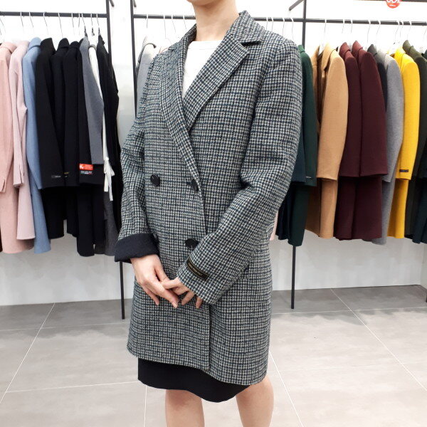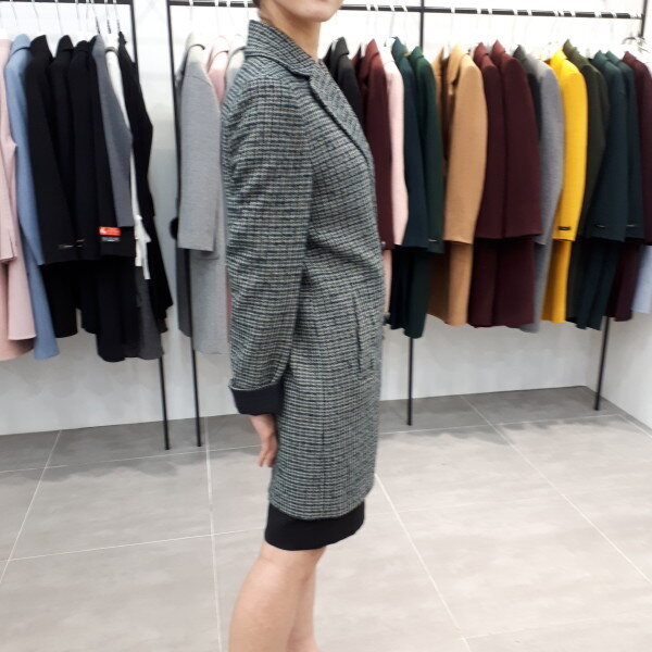 체크가 작은 패턴으로 더블 자켓으로 55사이즈 입으신 분은 허벅지까지 내려온 기장입니다