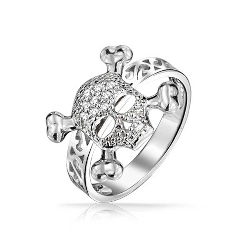 -. Feature : Skull and Crossbones Ring / 3mm Band Width / Filigree Band / .925 Sterling Silver, Cubic Zirconia, Rhodium Plating