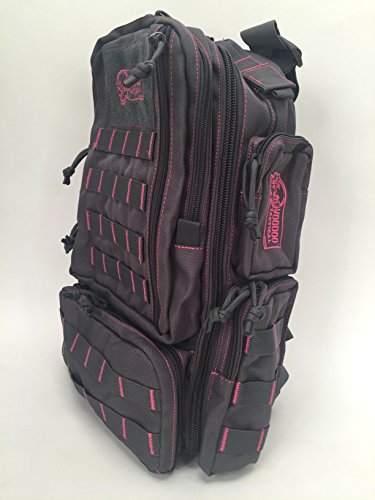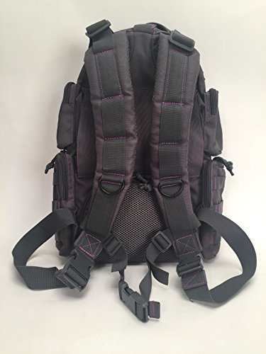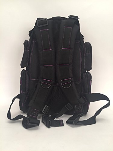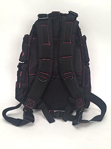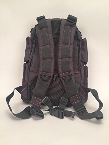 -. Feature : Thickly padded, adjustable, removable shoulder and sternum straps. / Hydration compatible with center, right or left routing system. / Inside mesh zipper pockets for ease of item location. / Front, rear and side storage compartments. / Red pack-cloth construction.