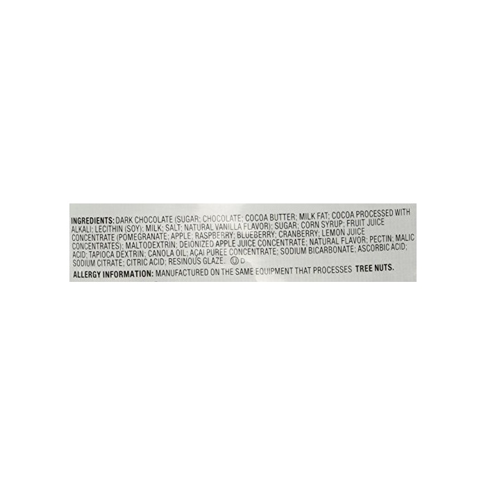 원재료: 쵸코렛(설탕,카카오 마스,코코아 버터,전분유,코코아 파우더,식염)고, 농축 과즙(아침 E,블루베리,《라즈베리쿠란베리》,석류,L 다《―베리》,레몬)고, 설탕,콘 시럽,말《도데키스토린》,식물성 기름지,레시틴(대두 유래)고, 겔화 제(백 친)고, 구연산,사과산,향료,비타민C,광택 제