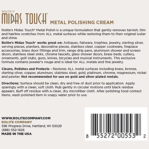 ReleaseDate : 2017-09-20 Studio : Rolite Company Publisher : Rolite Company Binding : Misc. Product Description Rolite' s Midas Touch works great on: Antiques, flatware, trophies, jewelry, sterling silver, serving pieces, planters, decorative pieces, stainless steel, copper cookware, fireplace accessories, brass door fittings and trim, range drip pans, aluminum shower and screen doors, stainless steel sinks, chrome faucets, glass shower doors, brass beds, cutlery, ornaments, golf clubs, guns, knives, bicycles and musical instruments This exclusive formula contains jeweler's rouge and is ideal for ALL metals and fine jewelry Not recommended for use on gold and silver plated metals Directions: Surface should be clean, dry and free of dust prior to application Apply sparingly with a clean, soft cloth Rub gently in circular motions until black residue appears Buff off residue with a clean, dry microfiber cloth After polishing food contact items, wash polished item in soapy water prior to use. This brings out the maximum luster a mirror like finish in jewelry. 0