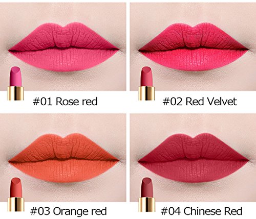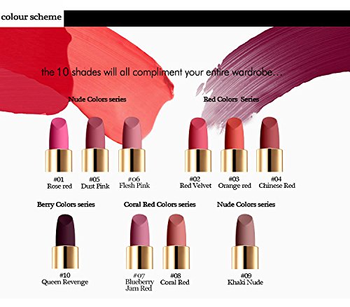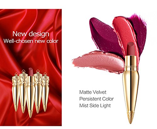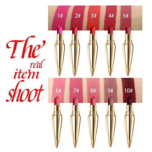 -. Binding : Misc. -. Brand : Face Forever -. Feature : Sculpts: Multi-faceted pigments create definition. Lips look beautifully shaped, sculpted, curvaceous. / Color:#01 Rose red #02 Red Velvet #03 Orange red #04 Chinese Red #05 Dust Pink #06 Flesh Pink #07 Blueberry Jam Red #08 Coral Red #09 Khaki Nude #10 Queen Revenge / Deeply replenishes, softens and moisturizes lips for up to 8 hours.Lips feel comfortable and smooth for hours / Intense color glides on evenly and looks satiny.Help protect delicate lips against environmental damage / Gold Scepter Shape Tube,Lavish gift box packaging . -. IsAdultProduct : 0 -. Label : Shuoluo -. Manufacturer : Shuoluo -. MPN : SLL002 -. PackageQuantity : 1 -. PartNumber : SLL002 -. ProductGroup : Beauty -. ProductTypeName : BEAUTY -. Publisher : Shuoluo -. Studio : Shuoluo -. Title : Scepter Lipstick Women`s Velvet Matte Sculpting Lipstick Pure Colors Long Wear,Smooth,Waterproof,Moisturizing,Suitable to all type of skin.10 Color Could be Use As Pendant