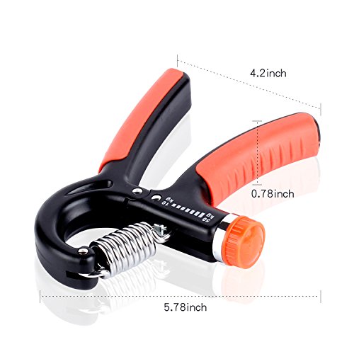 WHY CHOOSE BOGI GRIP STRENGTHENER: 1. Longer finger and palm handle hand grip strength exerciser, so that it fits well in the hand for kids and adults ,Longer than normal gripper in market,solved the problem that leave pinky finger off the edge 2. Adjustable hand gripper offers resistance levels from 22lbs - 110 lbs(Most is 22-88lbs in Market 3. Ergonomic design with embedded rubberized hand exerciser for a comfortable grasp Size of hand grip : 17x12.5x1cm (6 x 3.54x 0.82Inch),compact size as one iphone 7 Plus Cleaning tip: wipe with a damp cloth.