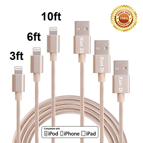 Lightning Cable, Xun Di 3Pack 3'/6'/10' FT Nylon Braided 8 Pin Syncing and Charging USB Cables Charger Cord for Apple iPhone 7/6/5SE, iPad Mini/Air, iPod Nano/Touch (Gold)