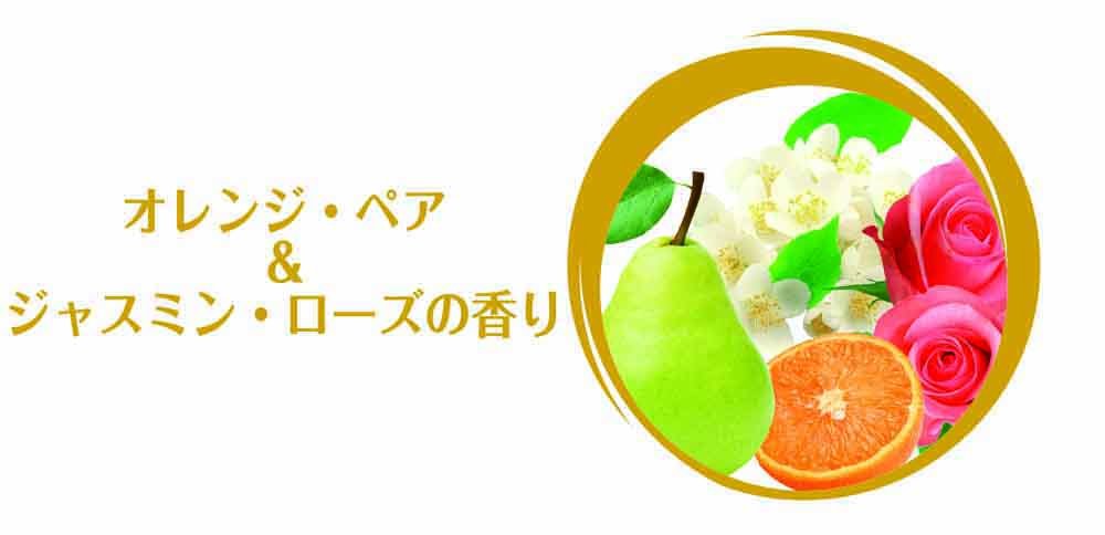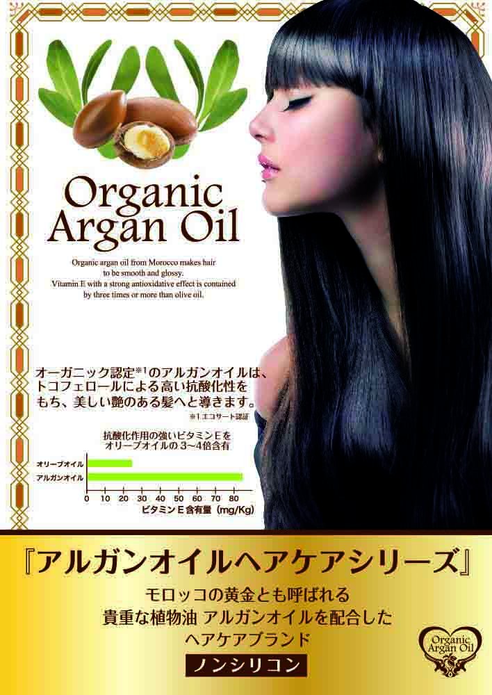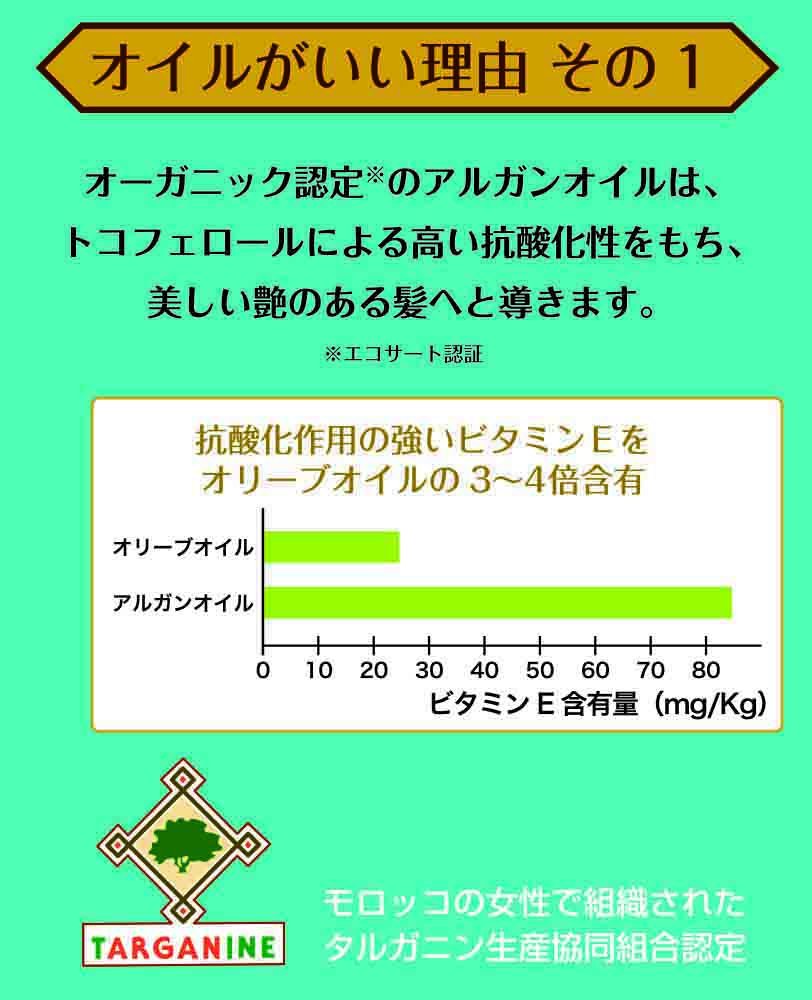 オーガニックアルガンオイル配合。水のようにサラサラでべたつかないオイルで毛先までしっとり潤う髪へ。オレンジ・ペア&ジャスミン・ローズの香り。