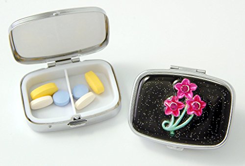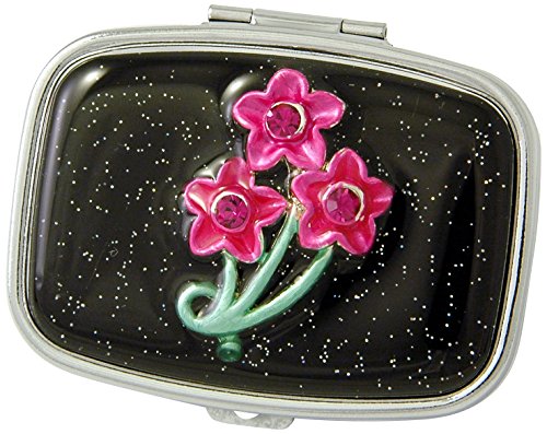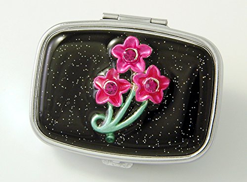 -. Feature : Multiple sections / Holds larger pills / Covered in shimmering black / Pink flower on cover / Lage: Ladies Cosmetic Bags