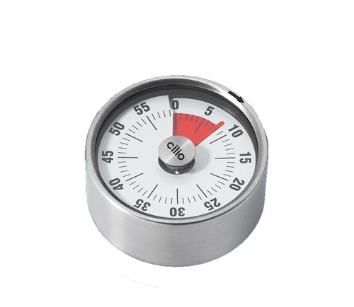 -. Feature : Frieling Cilio Stainless Steel Magnetic 60 Minute Kitchen "Gauge" Timer / Strong built-in magnet ~ Can be set for up to 60 minutes / Ringing is hard to overhear ~ Red area signalizes the time left / Available in Small ~ 2.25" diameter x 1.5" high or Large 3" diameter x 1" high. / Stainless Steel exterior