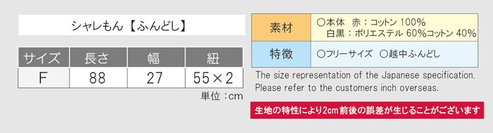 シャレもん面白デザインふんどし、フロントに[還暦]ってデザインされたフンドシです。人生一度は着用してみたいというお客様が結構いるみたいなので、どうせなら面白くしてみました!部屋着として快適なので、最近は女性でもフンドシ着用する方が多いです。褌をプレゼントしてみませんか?最初は、え~っ、フンドシ!?なんて言われますけど、プレゼントしたすぐには履かないかもしれませんが…こそっと、夜中にたぶん履いてくれますよw万が一履かない場合は…のれんにもなります(笑)ひざ掛けにもなるかも…、いや、ハチマキ!?ハンカチとか・・・ま、何でもいいんで笑ってくれるので大丈夫!!爆笑のプレゼントはこれで決まり!