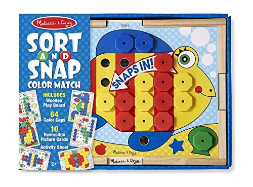 Toddlers will be fascinated and preschoolers will be inspired by this amazing color-matching and creative activity board. Ten reversible picture cards are held in place on a wooden play board when children place the snap caps in the holes. One side of the picture card is in color for matching. The reverse side shows the picture in black and white, allowing the children to create their own patterns and designs. This activity is great for color recognition, sorting, and beginning math skills, even has 3-D picture suggestions.