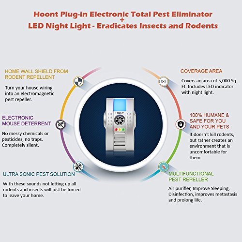 -. Feature : Simply plug it in this Hoont Electronic Total Pest Eliminator and watch your home become completely free of all pests, rodents and insects. Works for Rats, Mice, Ants, Roaches, Spiders, Bugs, Fleas, Bats and much More. / Prevent insects and pests from entering through outside walls. It works by causing home wiring to send electronic pulse signals thus irritating all pests. / The patented deep penetrating electromagnetic technology disturbs the nests of rodents and insects that are situated inside your home walls. / Ultrasonic, deep penetrating electromagnetic fields and negative-ion waves is highly irritating for rodents and insects. With these sounds not letting up all rodents and insects will just be forced to leave your home. / The Hoont Pest Eliminator is completely inaudible to people and pets such as dogs, cats, birds, and fish. The Hoont Pest Eliminator is the most humane method for being pest free; it doesn't kill rodents, but rather creates an environment that is uncomfortable for them, so they simply leave. / COVERAGE AREA: 5,000 Sq. Ft. / Package includes 2 Pest Repeller Units. [Upgraded to be more robust and powerful]
