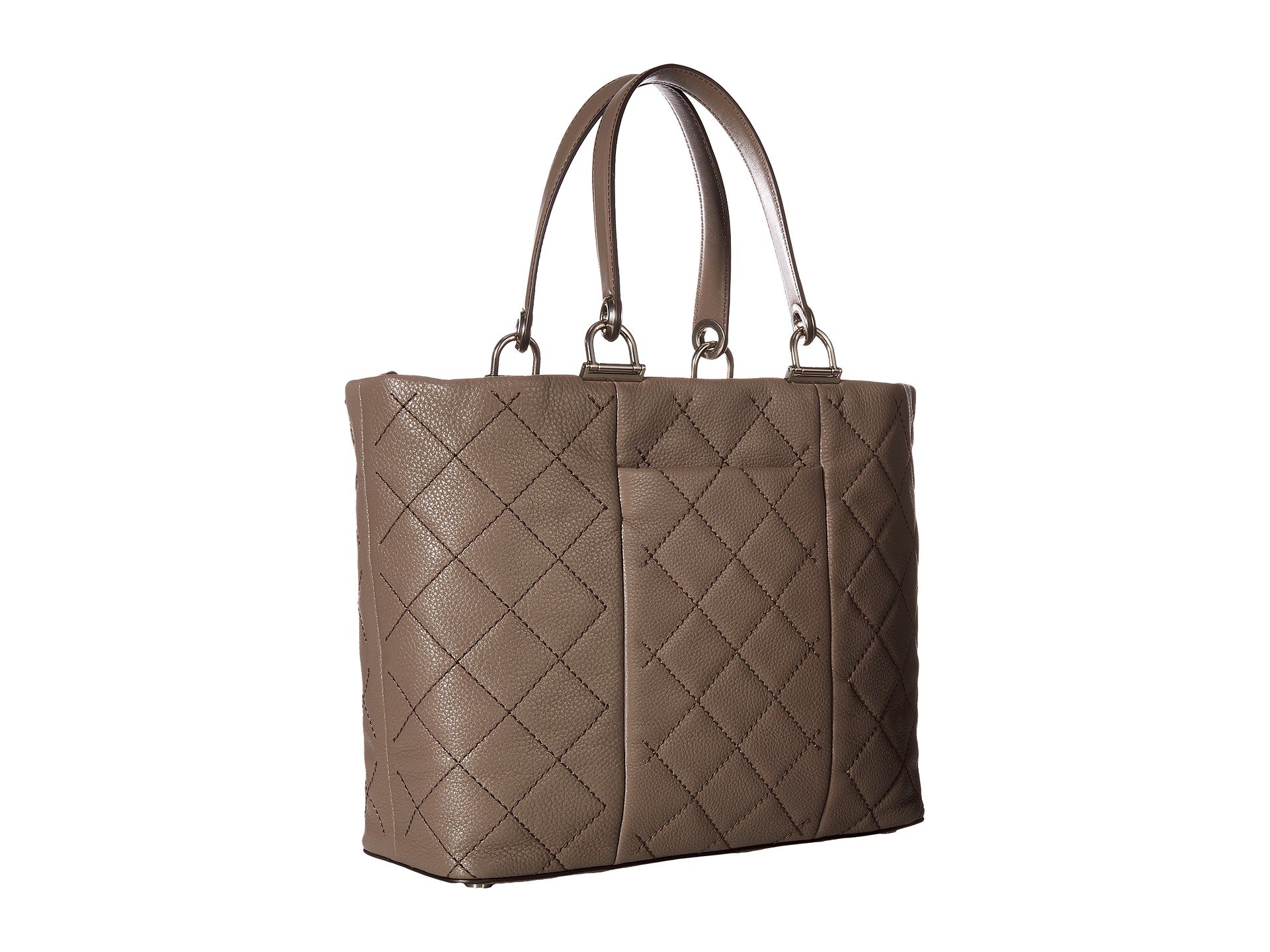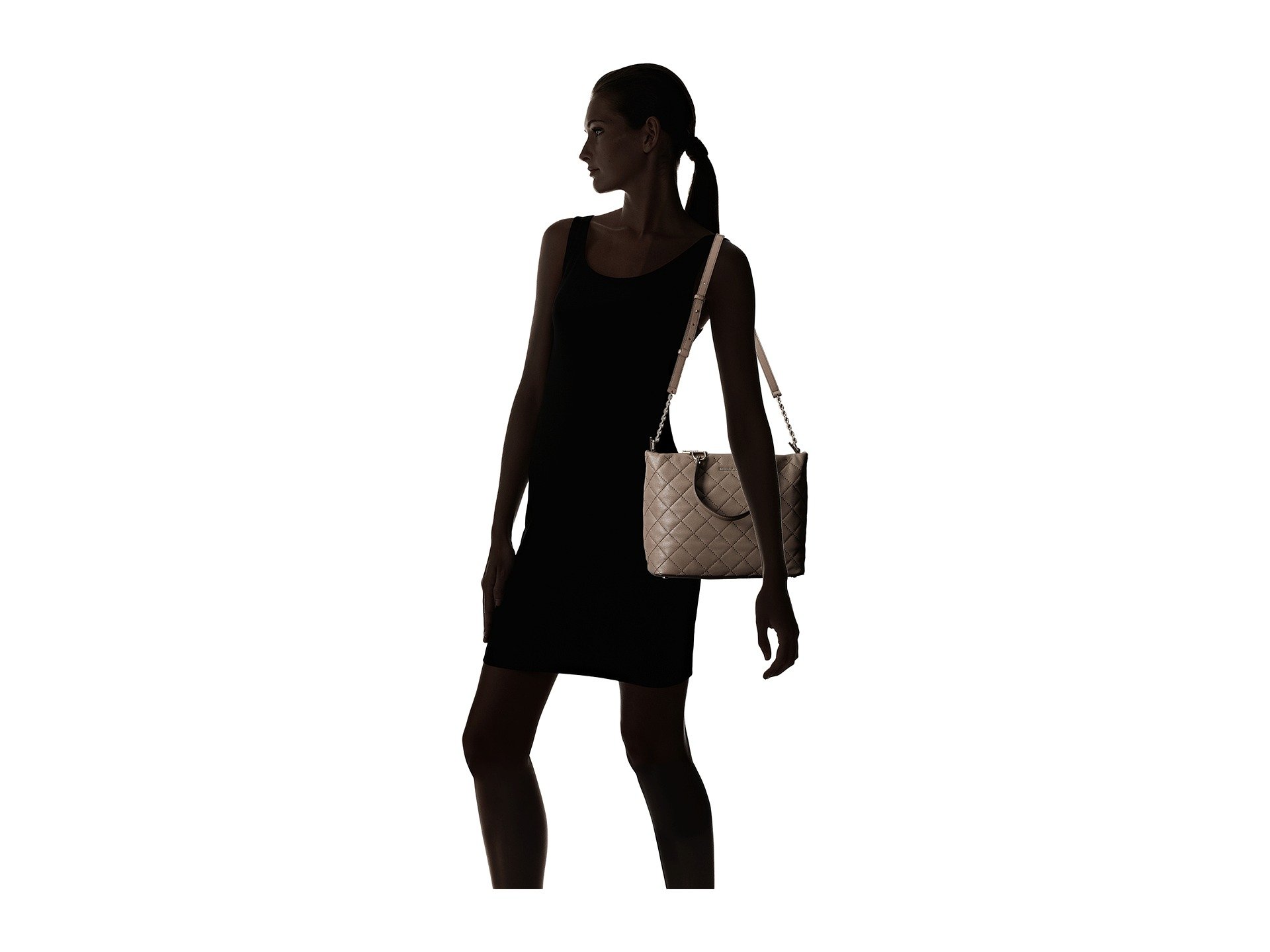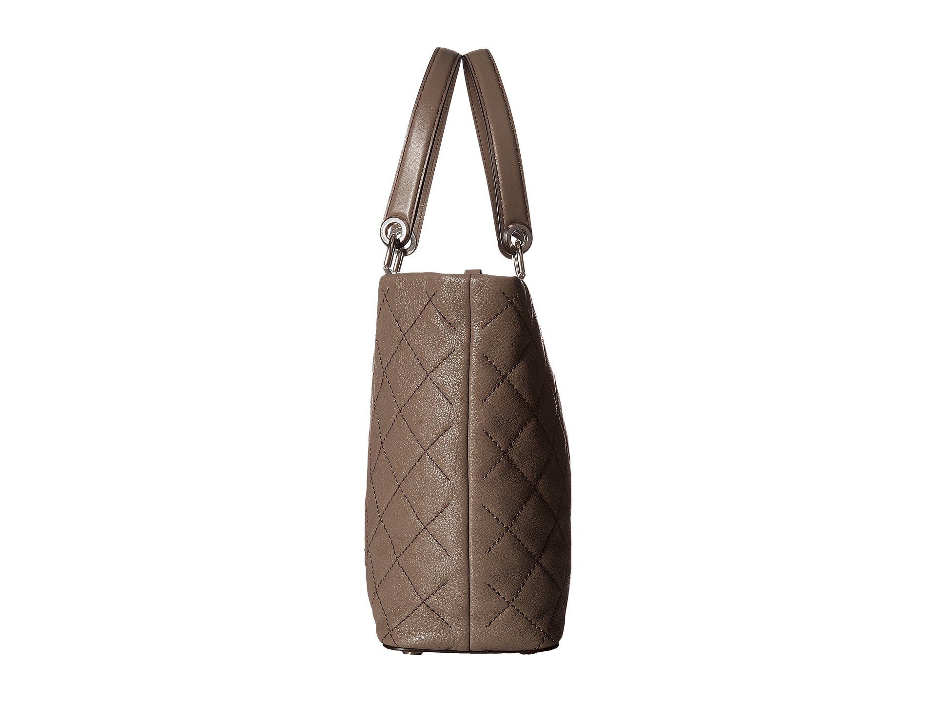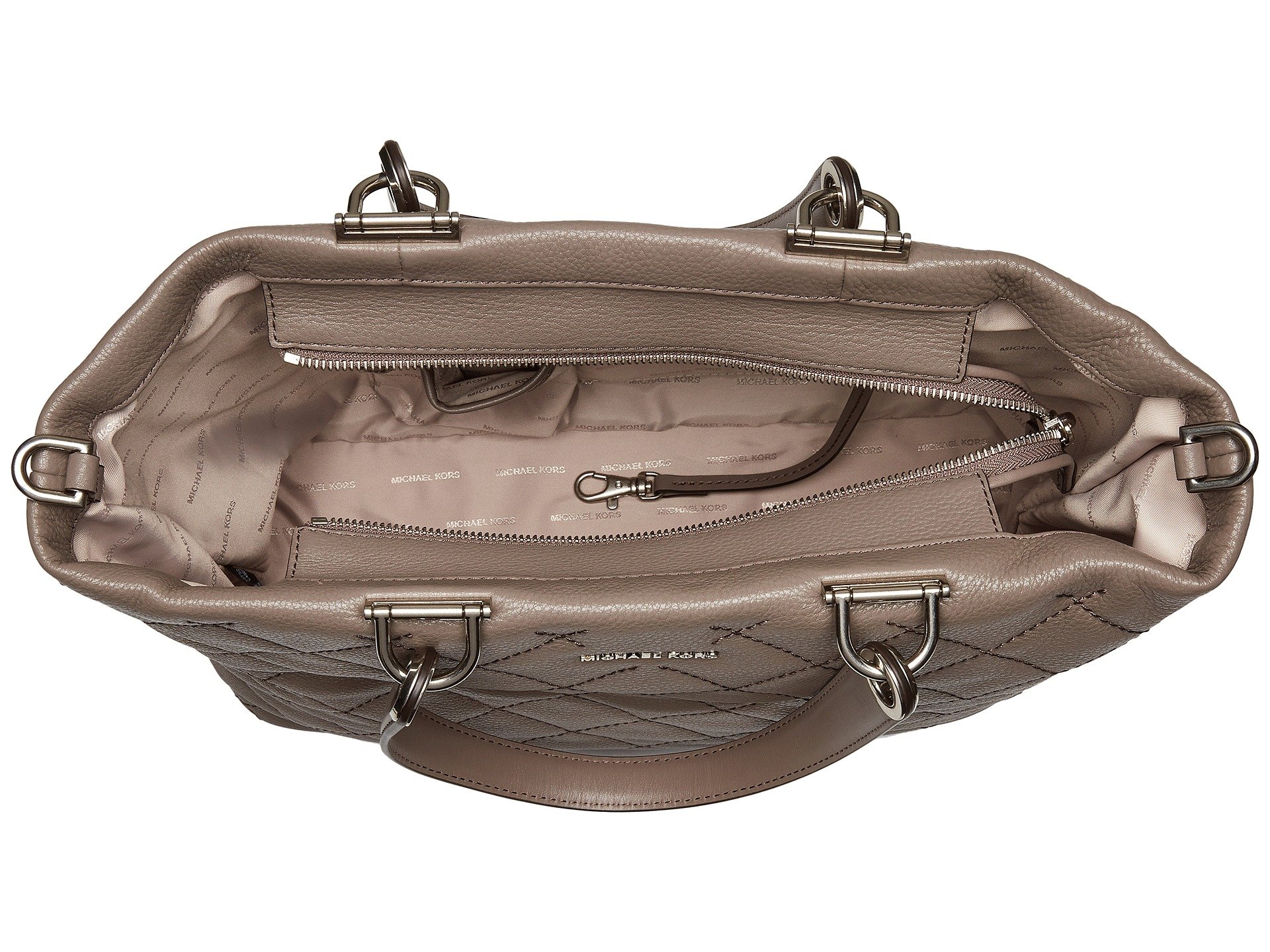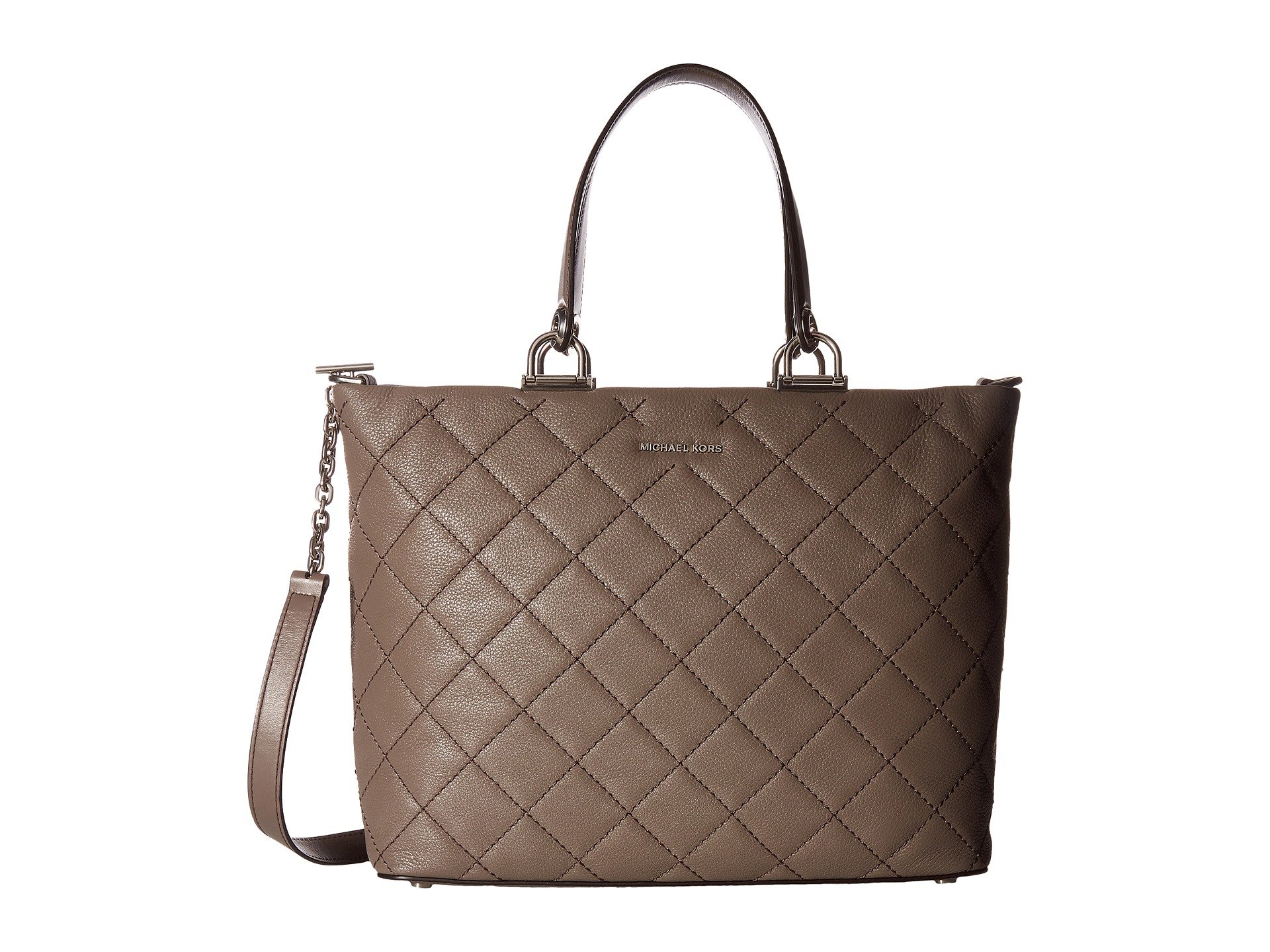| Product Information SKU: #8834316The quilted elegance of the MICHAEL Michael Kors™ Loni Large East/West Tote is a marriage of chic style and functionality that you cannot pass up!Large tote-style shoulder bag made of lightly pebbled leather in a classic quilted pattern.Dual leather elbow straps, with a detachable crossbody strap.Signature logo hardware.Rear slip pocket.Ultra organized interior features a back-wall zip pocket, two slip pockets, and a key clasp.Flat base to provide upright structure.Imported.Zip closure.This product may have a manufacturer's warranty. Please visit the manufacturer's website or contact us at warranty@support.zappos.com for full manufacturer warranty details.Please note, the hardware color and interior lining may differ from the color shown in the photo.Measurements: Bottom Width: 13 in Extended Depth: 5 in Height: 11 in Strap Length: 46 in Strap Drop: 23 in Handle Length: 17 in Handle Drop: 7 1?2 in Weight: 1 lb 15 oz |