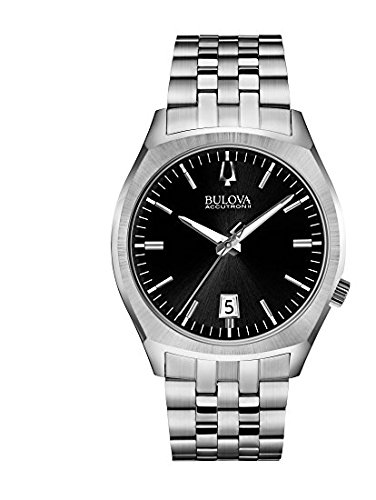 From the Surveyor Collection. Crafted of stainless steel, double-curved K-1 mineral glass box crystal, black sunray dial, luminous hands, calendar, second hand, off-center crown, screw-back case, and double-press deployant closure and water resistance to 30 meters.