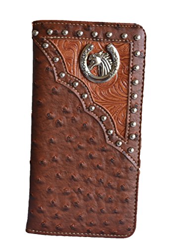 -. Binding : Apparel -. Brand : Stony West -. Department : mens -. Feature : Top Quality ostrich embossed patent leather wallet with contrasting floral trim accented with silver tone horse concho and studs / 6 credit card slots,removable checkbook cover, 2 compartments, clear id holder / Measurements: 7" x 3.75"x .5" / The perfect gift for yourself or someone else with this high quality wallet -. PackageQuantity : 1 -. ProductGroup : Apparel -. ProductTypeName : ACCESSORY -. Size : Small -. Title : men brown black horse head concho ostrich animal long wallet western