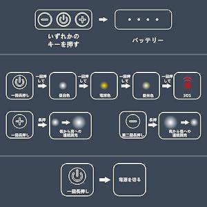 内部では輝度記憶チップ内蔵で、一度電源を切って再起動しても、そのままの輝度が維持する機能です。この機能によりお好みの輝度の光は毎回使うときにも維持することができるし、停電やバッテリー残量不足の場合でも電池の量を節約することもできます。(ご注意:輝度記憶機能は再起動しても輝度を維持するままに光りますが、光色は設置の光色「昼白色→暖色→白色→SOS」のままに点灯します。)