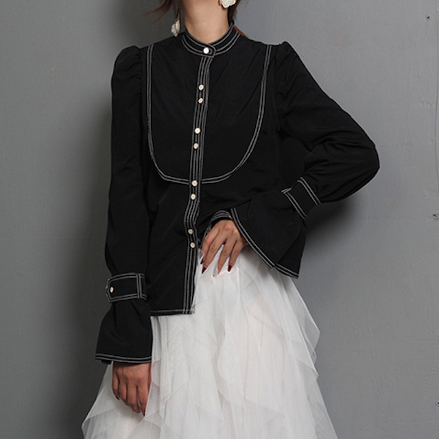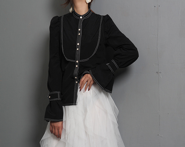ステッチやベルスリーブなどが印象的で華やかな雰囲気の長袖フリルシャツです。