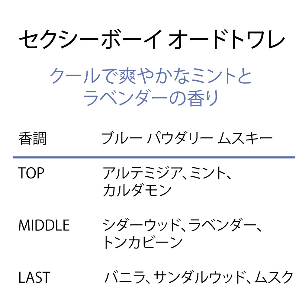 「ジャンヌアルテス セクシーボーイ 100ml (EDT・SP)」は、男性のセクシーさを引き出す大人気のフレグランスです。爽やかなシトラスの香りをベースにメンズにはめずらしいパウダリーな甘さが魅力的。ミントの爽快感と、アロマの温かさが絶妙なブレンド。包み込むようなやわらかな甘さが男性のセクシーさをどきっとするほど引き出してくれます。ボトルの、深いきれいなブルーが印象的。