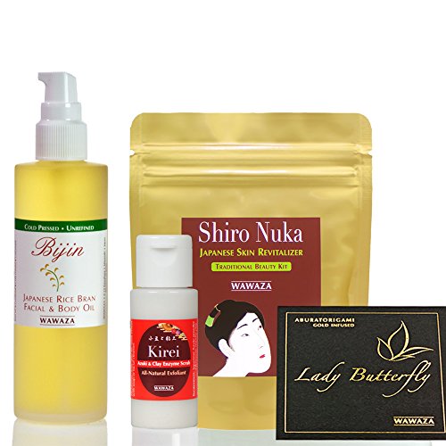 ♥ Exfoliate and deep cleanse with KIREI Azuki and clay enzyme scrub ♥ Tone and lighten with SHIRUO NUKA stone-ground rice bran and germ powder ♥ Moisturize and diminish wrinkles with BIJIN cold-pressed rice bran oil ♥ Remove excess oil without drying skin with pulp-free 'aburatorigami' paper Complete directions included. ① Kirei Azuki and Clay Enzyme Scrub Deep cleanses pores, leaving a soft, smooth and radiant glow. Ingredients: Japanese Azuki powder, Okinawan marine clay. Net Weight: 25 grams ② Japanese Shiro Nuka Rice Bran Skin Revitalizer Powder Apply it the Japanese traditional way with a cotton sash bag (2 included), or use it as a brightening face wash. You can also mix it with soap lather, or apply it as a facial mask. Ingredients: 100% germ and bran of Japanese rice (Oryza sativa japonica). Net Weight: 130 grams ③ Bijin Pure Rice Bran Facial and Body Oil 100ml Moisturize and nourish face, neck and body's soft skin areas. Great for delicate skin and around eyes. Ingredients: 100% Japanese rice (Oryza sativa japonica) bran oil. Contents: 100 ml ④ Lady Butterfly Aburatorigami Facial Blotting Paper Look and feel your best, all day long. Obliterate oil without smearing makeup. Touch-up foundation to create a stunning canvass. Eliminate need for oil control products. Material: 100% pulp-free paper from leaf of Abaca (Musa textilis) plant. No additives, fragrances, powder or artificial materials. Contents: 50 Sheets, 90 x 90 mm each 0 |