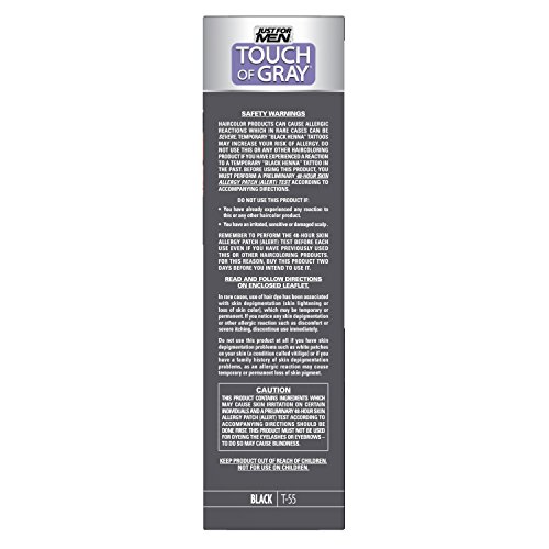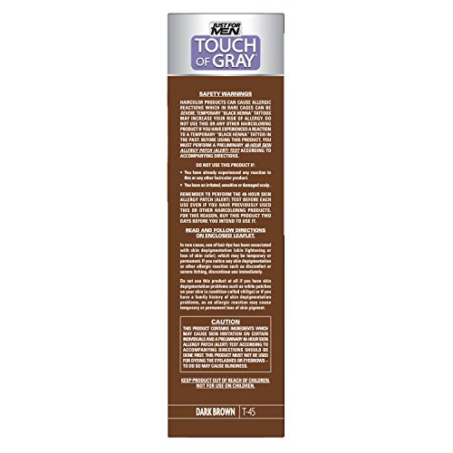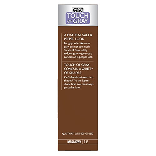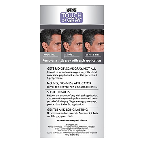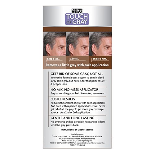 -. Binding : Health and Beauty -. Brand : Just for Men -. Color : Light Brown/Gray -. Feature : Advanced air oxidation haircolor system designed to eliminate a portion of your gray / No-mix, no-mess system for 5 minute easy application / Works gradually and will never color all the gray / Permanent formula lasts 5-6 weeks and is peroxide and ammonia free / Made in the USA -. IsAdultProduct : 0 -. Label : Just for Men -. Manufacturer : Just for Men -. MPN : Gray-p -. PackageQuantity : 3 -. PartNumber : Gray-p -. ProductGroup : Beauty -. ProductTypeName : ABIS_DRUGSTORE -. Publisher : Just for Men -. Size : 2 Pack -. Studio : Just for Men -. Title : Just For Men Touch Of Gray, 1 Application (Pack of 3)