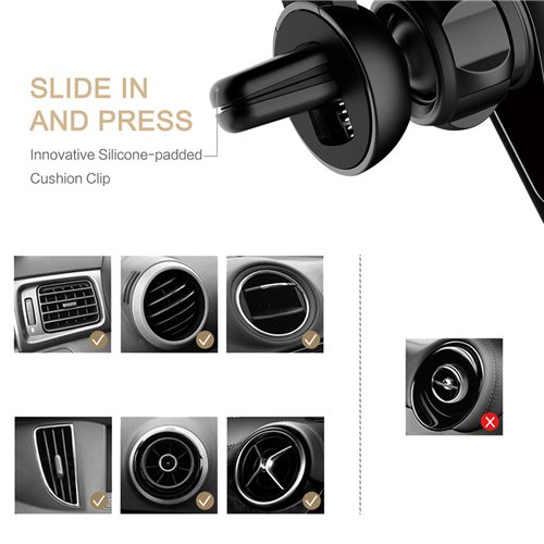 - SAFE AND STABLE - In this cell phone mount, the support and arms form a most stable triangle structure that securely holds your cell phone even during quick turns and speed bumps. The reinforced silicone mats protect your vehicle and phone against scratches in the meantime. Fixed tightly on the air vent, this car mount for cell phone does not block sight, which ensures safe driving.