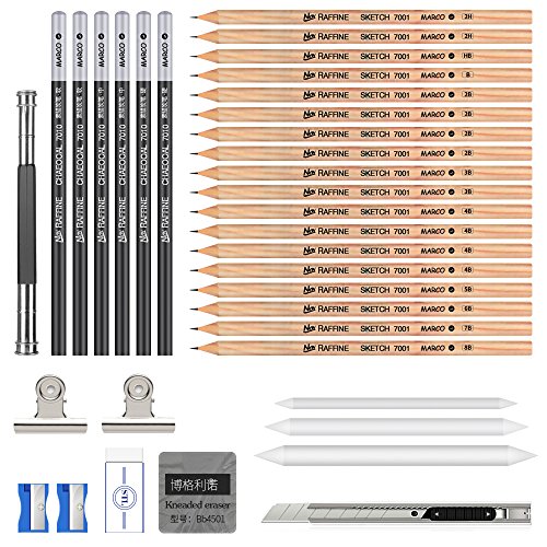 - ✎Here's What You Get : 18 premium graphite pencils (2H,HB,B,2H,2B,3B,4B,5B,6B,7B, 8B) + 6 charcoal pencil ( in soft, medium and hard) + 3 paper pencil + 2 art clips + 1 kneade eraser for erasing --Includes one PLASTIC/VINYL ERASER for erasing large areas effectively and completely + 2 sharpeners for graphite and charcoal pencils - designed to smoothly sharpen tips without breaking.
