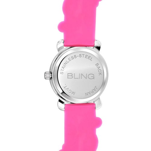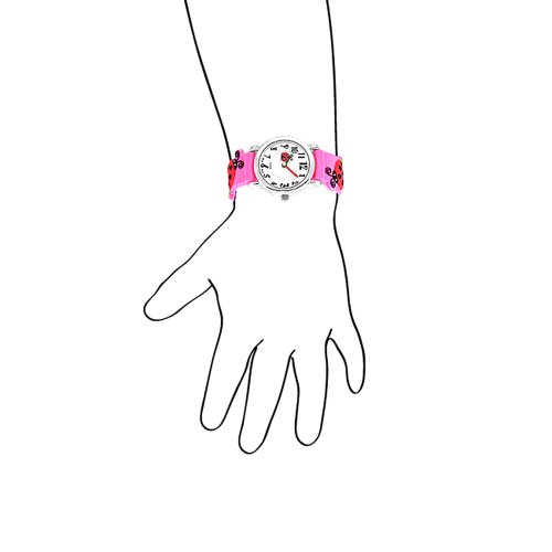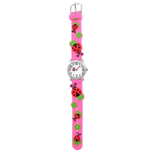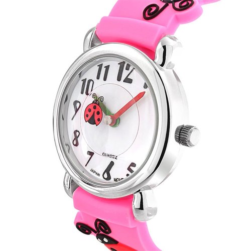 Charm your little princess with this cute 3D pvc, red and black lady bug with four leaf clover design pink rubber strap watch. This is perfect watch for the child who is learning to read analog time. It's green and red hands makes it easy to read the hours and minutes. It's stainless steel back, soft rubber strap and stainless steel buckle, make this a sturdy and comfortable watch for everyday wear. This watch is sure to get your child excited about learning analog time.