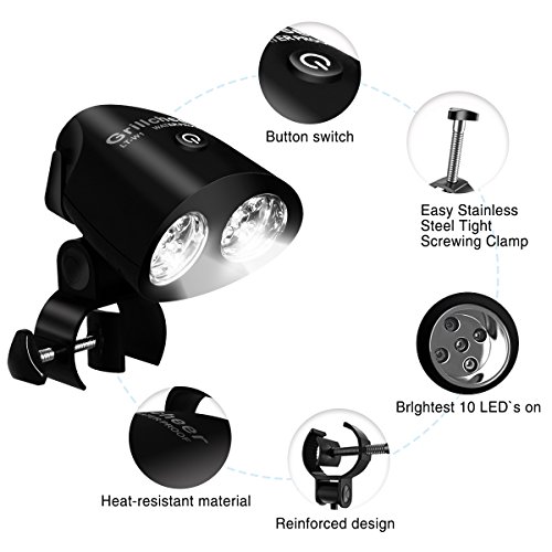 - 4)White Bright Light Makes the Barbecue Meal Clear: It can lights up the entire grill with brilliant LED light.10PCS high quality 100 lumen LED lamps which illuminate 50,000 hours glow bright and white light instead of traditional yellow light, don’t need to worry about burnt or under-cooked food when you're barbecuing in dark.You can enjoy your barbecue meal safely.The grill light is more energy-efficient and has a longer service life than other brands on market.
