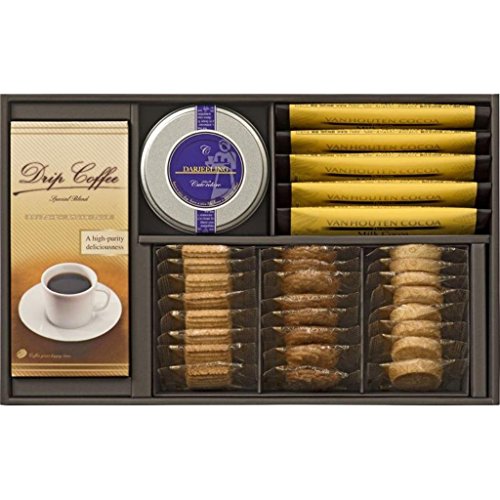 原材料:モンカフェドリップコーヒー〈スペシャルブレンド〉(7.5 g×5袋)・ティーバッグ〈ダージリン〉(2.5 g×8袋)・バンホーテンスティック〈ミルクココア〉(18 g)×5・クッキー(24個)×各1
