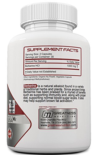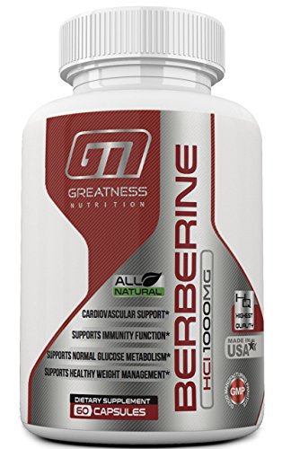 Greatness Nutrition Berberine HCl 1000mg - a natural Blood Sugar Support Supplement: This All-Natural Dietary Supplement Designed to Support a Healthy Metabolism, Heart Function, Weight Management, Promote Lower Blood Sugar Levels More.? It was used in ancient China. It's been popular for centuries, but today we know even?more about the amazing potential of berberine. That's why Greatness Nutrition offers Berberine HCl 1000mg per serving, two capsules a day may help to: ? Support healthier glucose metabolism - help to control blood sugar ? Promote cardiovascular health... also may aid in improving your lipid profile (total cholesterol, HDL LDL triglycerides) ? Support your healthy immune system ? Promote healthier weight BMI ? Aid in activating "brown fat," believed to help you burn calories reduce unsightly "white fat" Best of all, this all-natural complex is manufactured right here in America in a clean, safe facility regularly inspected by the FDA. Contains absolutely: ? No FDA-banned substances ? No salt or sodium ? No corn, wheat, or starch ? No glucose or lactose ? No preservatives ? No artificial flavor or coloring ? No milk or milk derivatives Backed by Our Full Guarantee - Order Now If you're not totally satisfied with your Greatness Nutrition Berberine, return the unused portion anytime for a full money-back refund. There's no risk, so add to your cart right away. 0 |