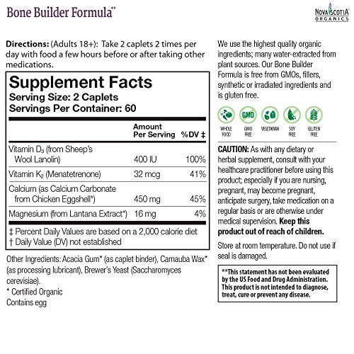 All good things begin with a solid structure, including your body. One way to feel and look your best each day is to have strong, healthy bones. As we age, this fact becomes even more important to help maintain a fit and active lifestyle. For many older people, bone loss is a reality of life when they get to a certain age. Weaker bones may lead to more frequent injuries due to bone fractures, tooth loss, more aches and pain and a reduced quality of life. The best way to combat problems with bone loss and an aging body is to make sure you supplement your diet with added calcium. This way, you can fight the impact that your aging bones and body may have on your activities and lifestyle. With Nova Scotia Organics Bone Builder Formula calcium supplements, you can start improving your bone health outlook. Our wholesome calcium vitamins contain no synthetic ingredients Genetically Modified Organisms (GMOs). We primarily use USDA Certified Organic elements. This way, you get a wholesome source of bone-building calcium you can feel good about putting into your body. We use eggshell powder as our main source of natural calcium, giving your body the building blocks to more robust bones and stronger teeth. We've also included a few calcium-friendly partners to help improve its impact on your body. Vitamin D3 is a perfect addition to help optimize the way calcium is absorbed into your bloodstream. Vitamin K2 is another beneficial ingredient that can additionally support new, stronger bone cell regeneration. We also include Lantana Camera extract powder for a natural magnesium source to help boost your ability to metabolize calcium. You can give your body the necessary ingredients to stay healthy and strong, even as you reach your senior years with bone vitamins you can feel good about.These statements have not be evaluated by the Food and Drug Administration. This product is not intended to diagnose, treat, cure or prevent any disease.Feature