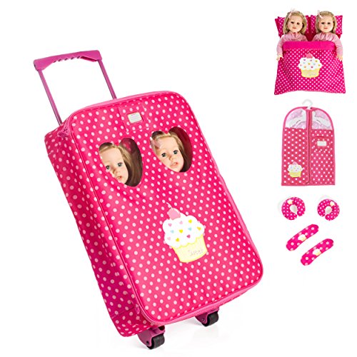 7 Piece twin doll Traveling Trolley Set Includes,Trolley, Garment bag, Two travel pillows, Twin sleeping bag with pillows,Eye covers for 2 dolls. Set does not include dolls!