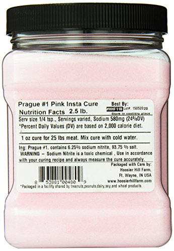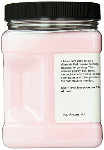 - Contains 2.5 lbs of Prague Powder No.1 Pink Curing Salt, also referred to as Tinted Cure or Pink Curing Salt. A critical component in the meat curing and sausage making process, enough to cure 1000 lbs of meat.