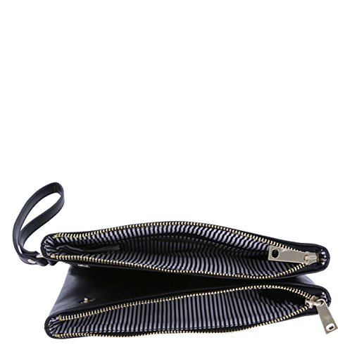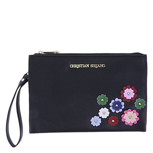 A perfect accessory for that perfect outfit! This designer clutch from Christian Siriano features a tumbled outer with colorful flowers adorned with studded centers, unique styling offers two separate lined compartments each with their own top zipper closure--one inside zipped pocket, two center functional snaps, and a 6 1/2" looped handle. Measures approximately 6 1/2"HX9 1/2"WX1/2"D. Manmade materials.Feature