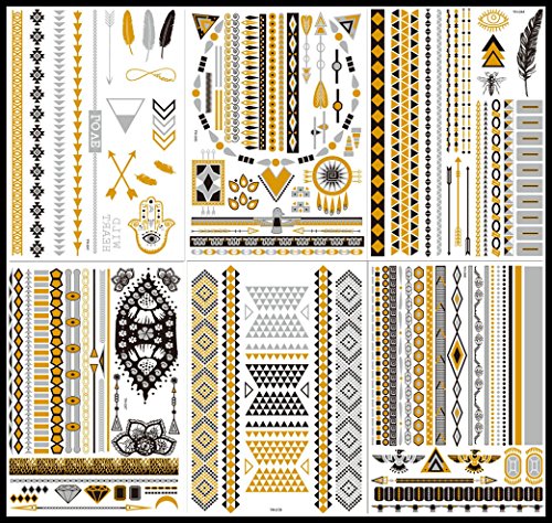 New Release, Dalin 6 Sheets Gold Silver Black Body Jewelry Temporary Metallic Tattoos Adult Temp Metallic Glitter Art FlashTattoos Long Lasting, Trendy Tattoo Designs - Angel Wings, Feather, Arrows and More