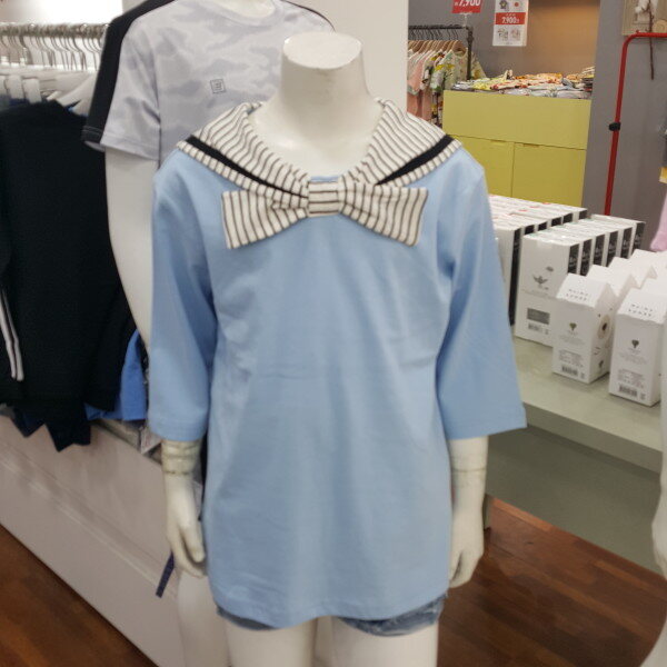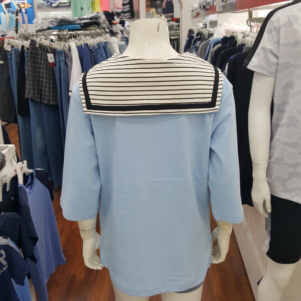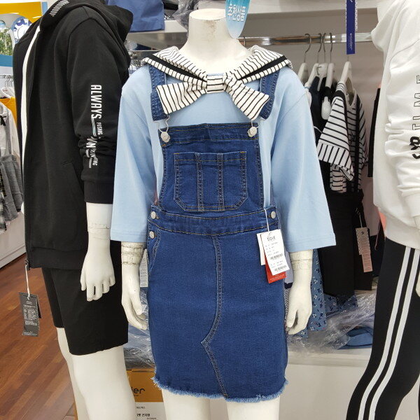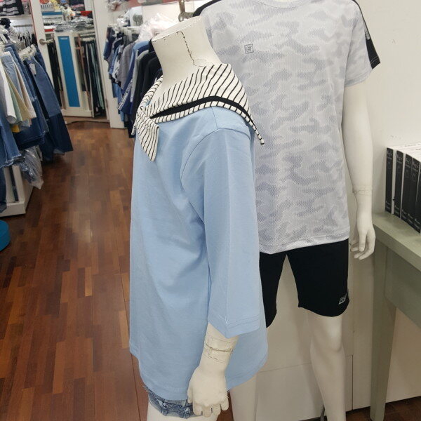 세라 7부 티 입니다.얇은 티셔츠라 늦여름하고, 초가을에 입으면 좋습니다.셋트 청 멜빵 치마: 18F1854 NY