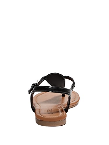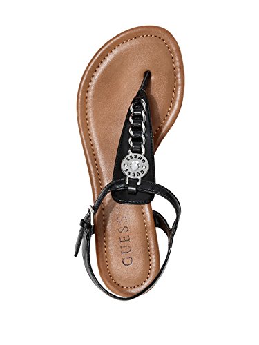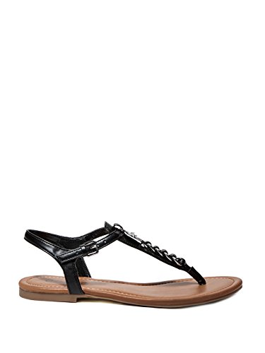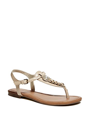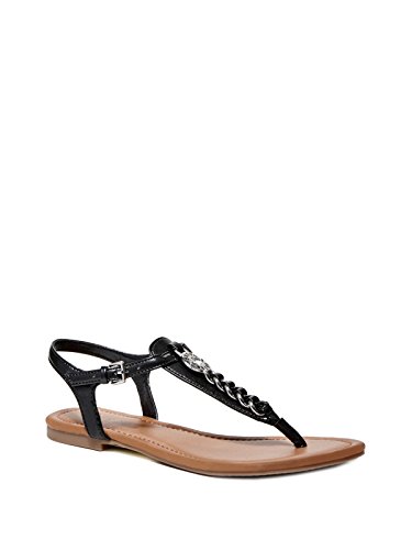 Casual glamour, perfected. A light-catching chain detail and shimmering rhinestones accent these wear-everywhere t-strap sandals.