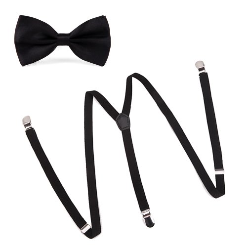 - Feature : Skinny Y-shape suspenders are eye-catching and stylish / Elastic stretches to accomodate most body types | Three durable metal clips fasten suspenders securely in place / Bowtie Dimensions: 5" x 2.5" / Both are fully adjustable | One size fits most / Package Contents: 1 x Bow Tie, 1 x Skinny Suspenders