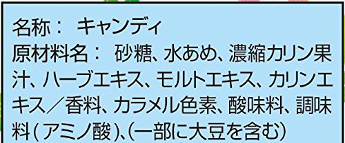 原材料:砂糖、水あめ、ハーブエキス、濃縮カリン果汁、モルトエキス、カリンエキス、香料、カラメル色素、調味料(アミノ酸)、(原材料の一部に大豆を含む)