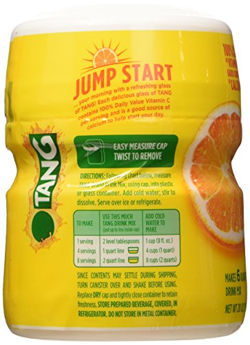 Jump start your morning with a refreshing glass of Tang! Each delicious glass of Tang contains 100% Daily Value Vitamin C per serving and is a good source of calcium to help start your day right.