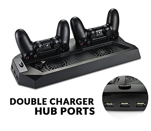 Double charger and hub ports - the ps4 cooling fan comes with double charging stations to recharge the controllers simultaneously. The 3 multiuse hub ports will speeds up your data transmission!