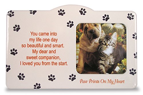 -. Feature : PICTURE FRAME FOR THE LOSS OF A PET. Beautiful paw P.R.Int picture frame for anyone who has lost their special fur baby. Inspiring paw P.R.Int p sits next to the picture of your faithful companion. Proudly display this picture frame on a deck, countertop, bookshelf, mantle, dresses, tv entertainment unit, kitchen island or nightstand. This will give you comfort knowing your special friend left paw P.R.Ints on your heart. / PET SYMPATHY GIFT. Provide comfort to a friend or family member who is strling with the loss of their best friend. / LOSS OF A DOG FRAME. LOSS OF A CAT FRAME. This cream ceramic frame with black PAW P.R.INTS and red words comes in a white box. Makes it easy to wrap or put in a gift bag. / HONOR THE LOSS OF A FURRY FRIEND. This frame is the perfect keepsake for anyone who loves their pet. With a loving memorial saying and a nice size are for a photograph of you and your faithful friend, this item will be cherished in your family for years. / SIZE: 9"W x 6"H, Ceramic. Square shaped picture opening holds a 4"W x 4"H photo of your furry friend.