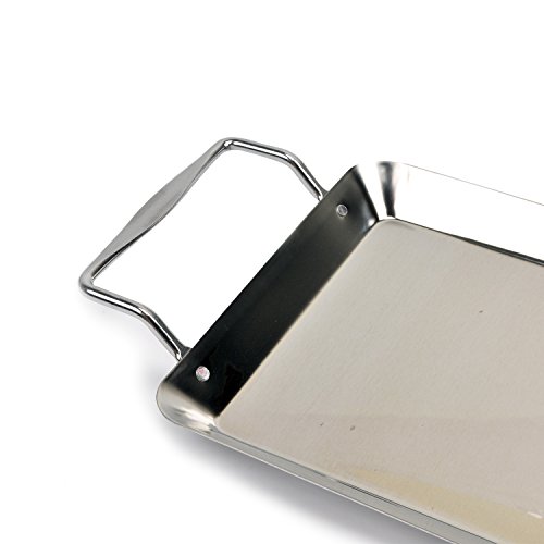 Serving plate have integrated handle makes from grill to served quick and easy without mess. Can also place under the hanger and grill vegetables with dripping to add flavor.