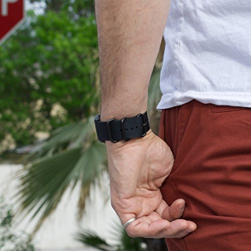NATO INSPIRED DESIGN; Styled after military G10 watch bands, our 1 inch wide premium NYLON straps feature two high quality, polished black steel Zulu rings and a buckle clasp