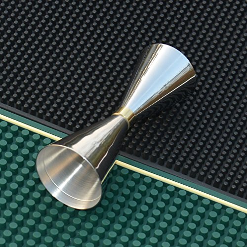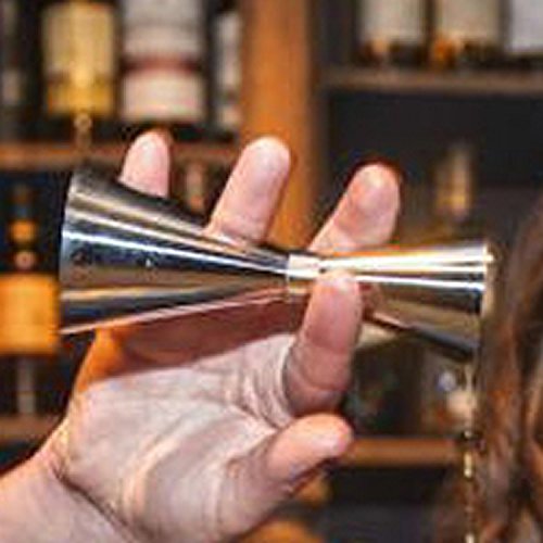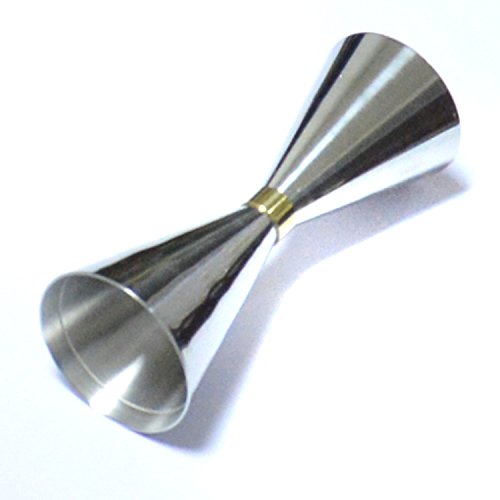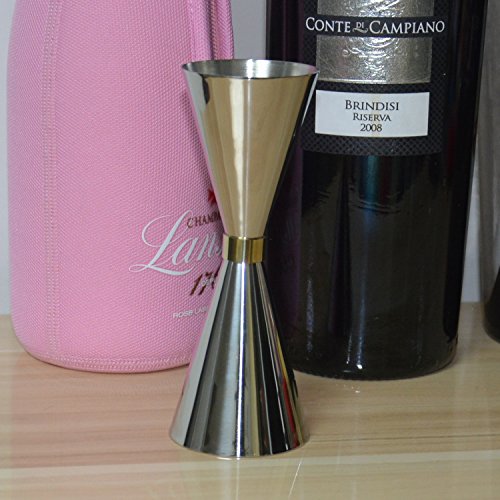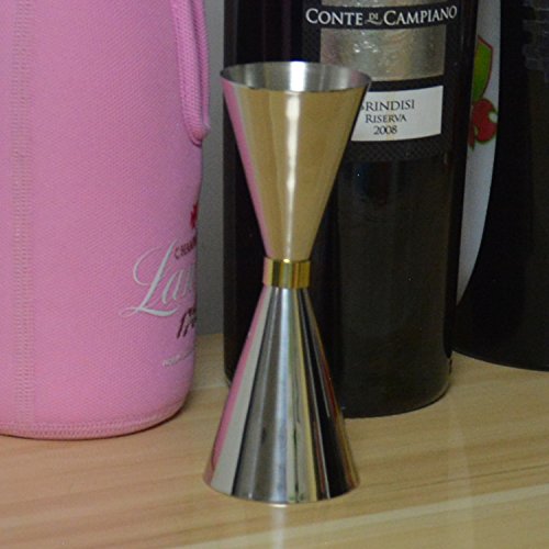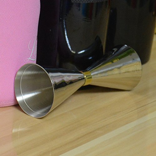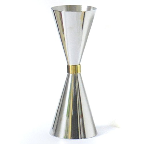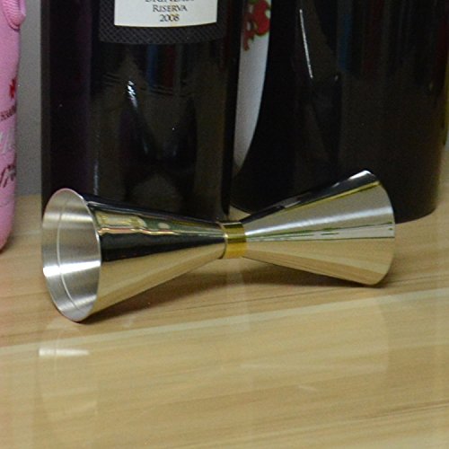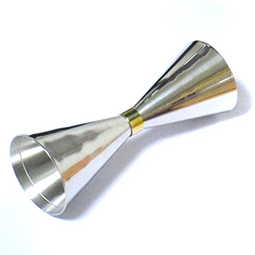 -. Feature : This convenient double jigger with elegant design provides efficiency and accuracy when dispensing spirits and alcohol for cocktail bars and clubs; / This jigger is made of durable, premium stainless steel construction with a shiny, polished outside and a matted inside, and has a slim waist is decorated with a fine, golden coloured ribbon; / The jigger consists of two measure cups. Each cup is equipped with two small, fine measurement lines at the inside. / Due to the engraved measurement lines at the inside, so easily use this jigger even in dark light conditions; / Extend your bar equipment with this extraordinary, classy and generous jigger;