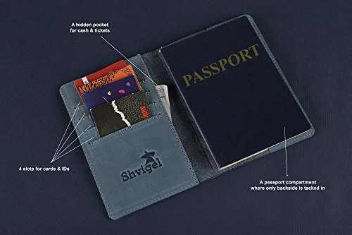 Passport Holder has a form of a book. There is a passport compartment on the right side, where only backside tackles in. On the left side there are 4 slots for credit / business cards and IDs, and a hidden pocket for money, tickets and other important papers. It is slim enough not to take much more room than a passport itself.