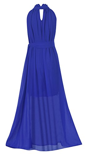 Maxi dress featuring sleeveless, ruffle neck, covered with a ribbon at waist