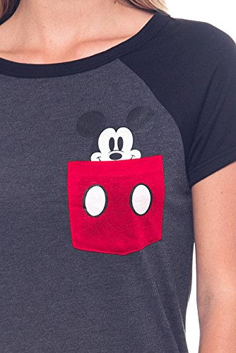 Mickey Mouse print has Mickey peeking out from behind the front pocket. Pocket and shoulders/sleeves are a contrast fabric. Officially licensed by Disney. Junior/teenage sizing; runs smaller/slimmer than regular women's sizing.Feature