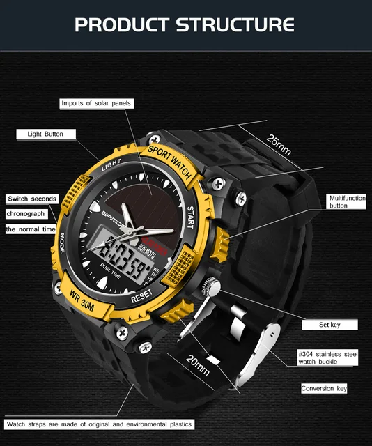 - 특징: 기초시계,뒤 빛,충격 방지,발광 다이오드 표시,자동 날짜,크로노그래프,달력을 완료하십시오,다수 시간대,물 저항하는,태양