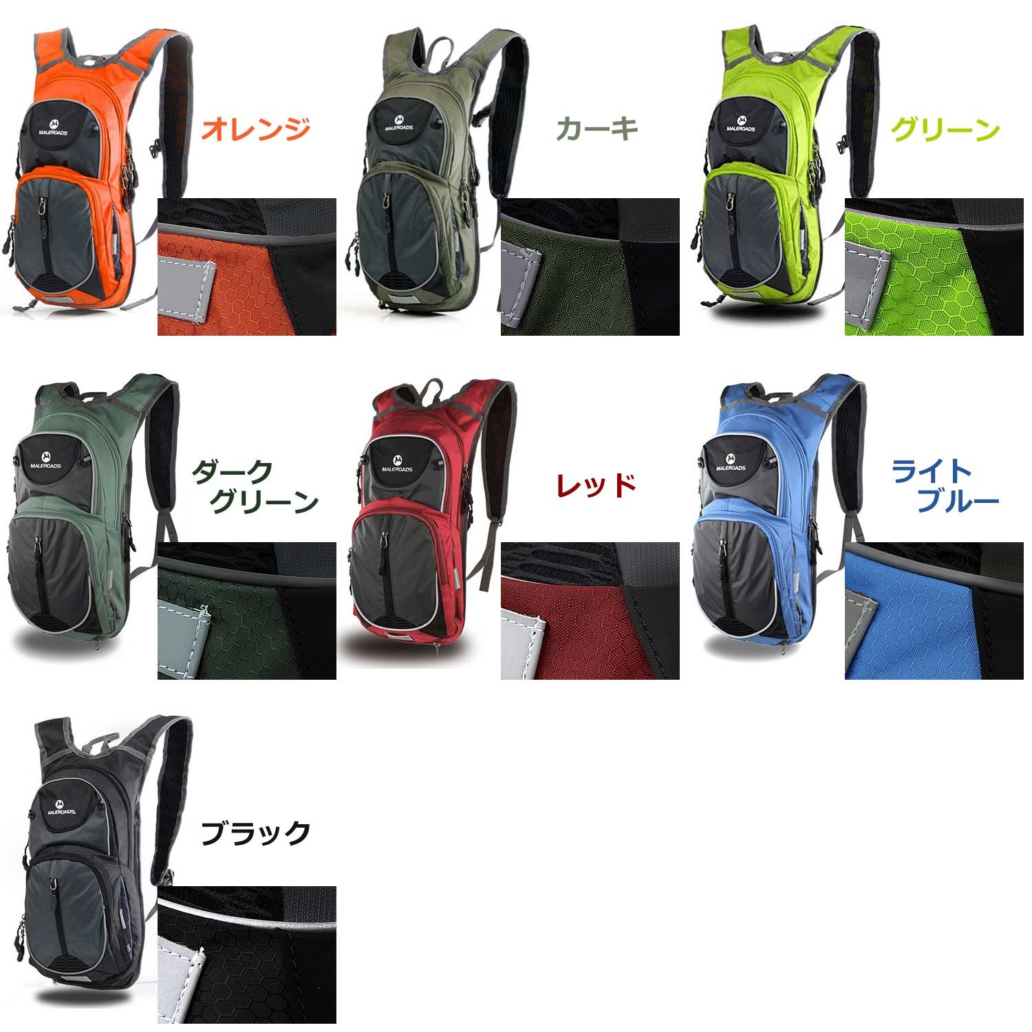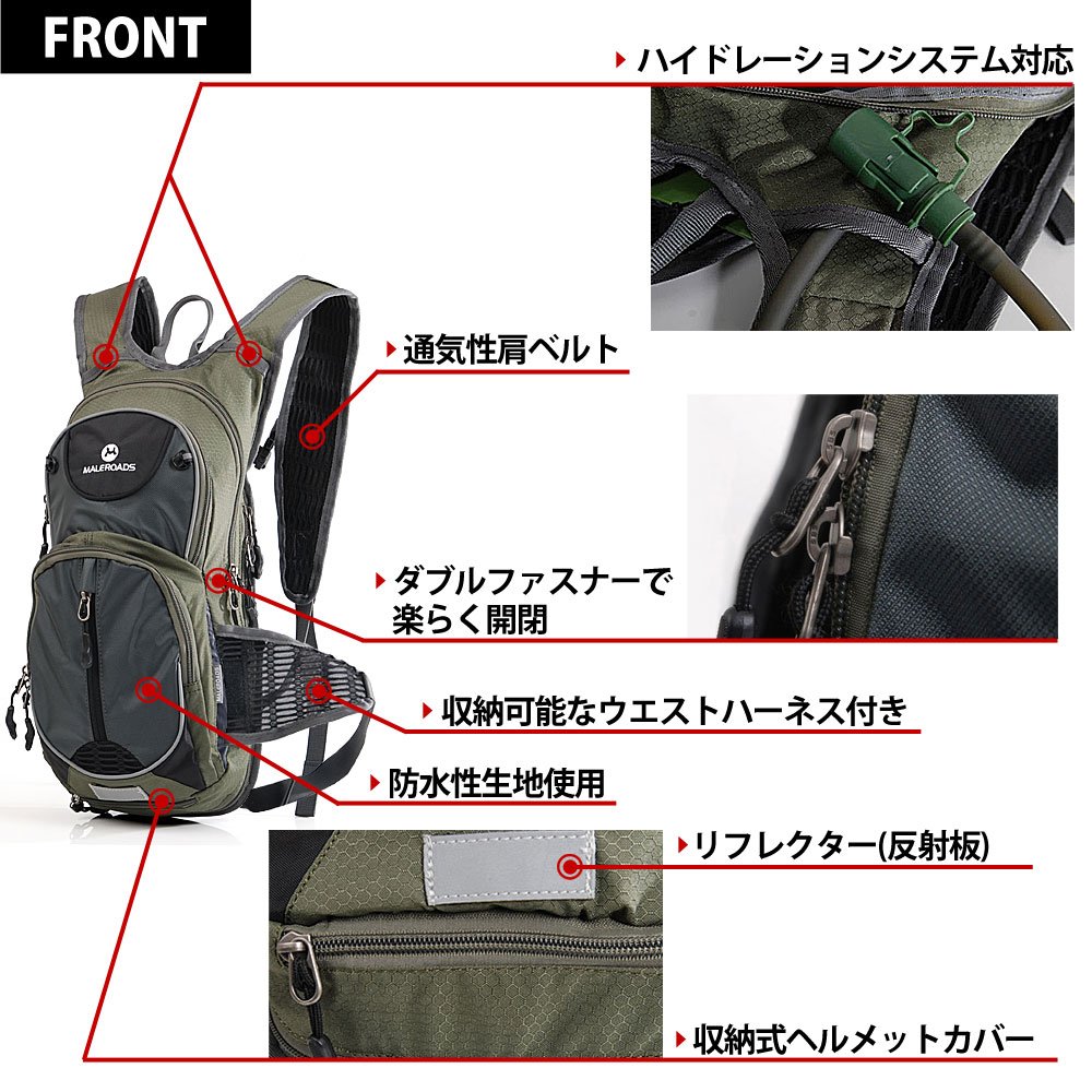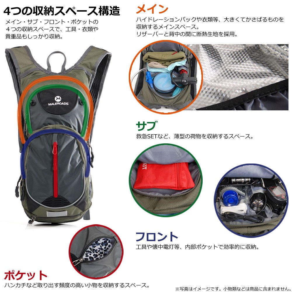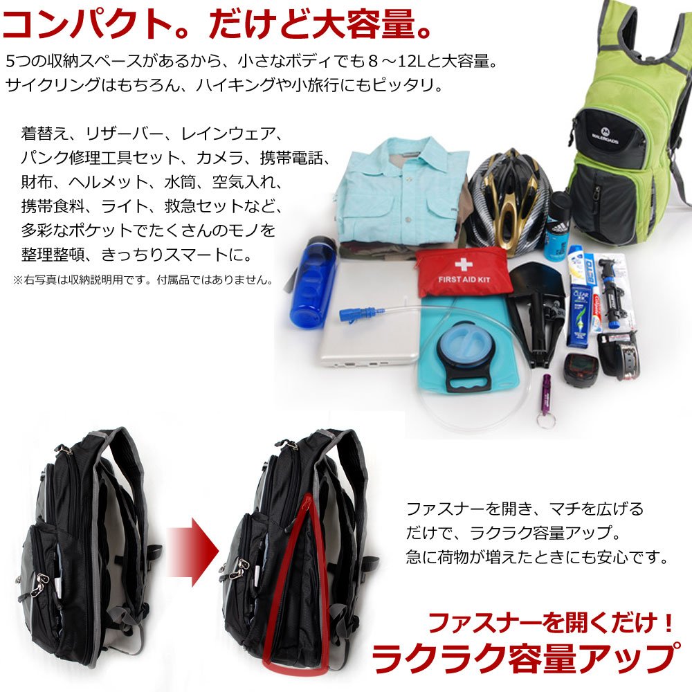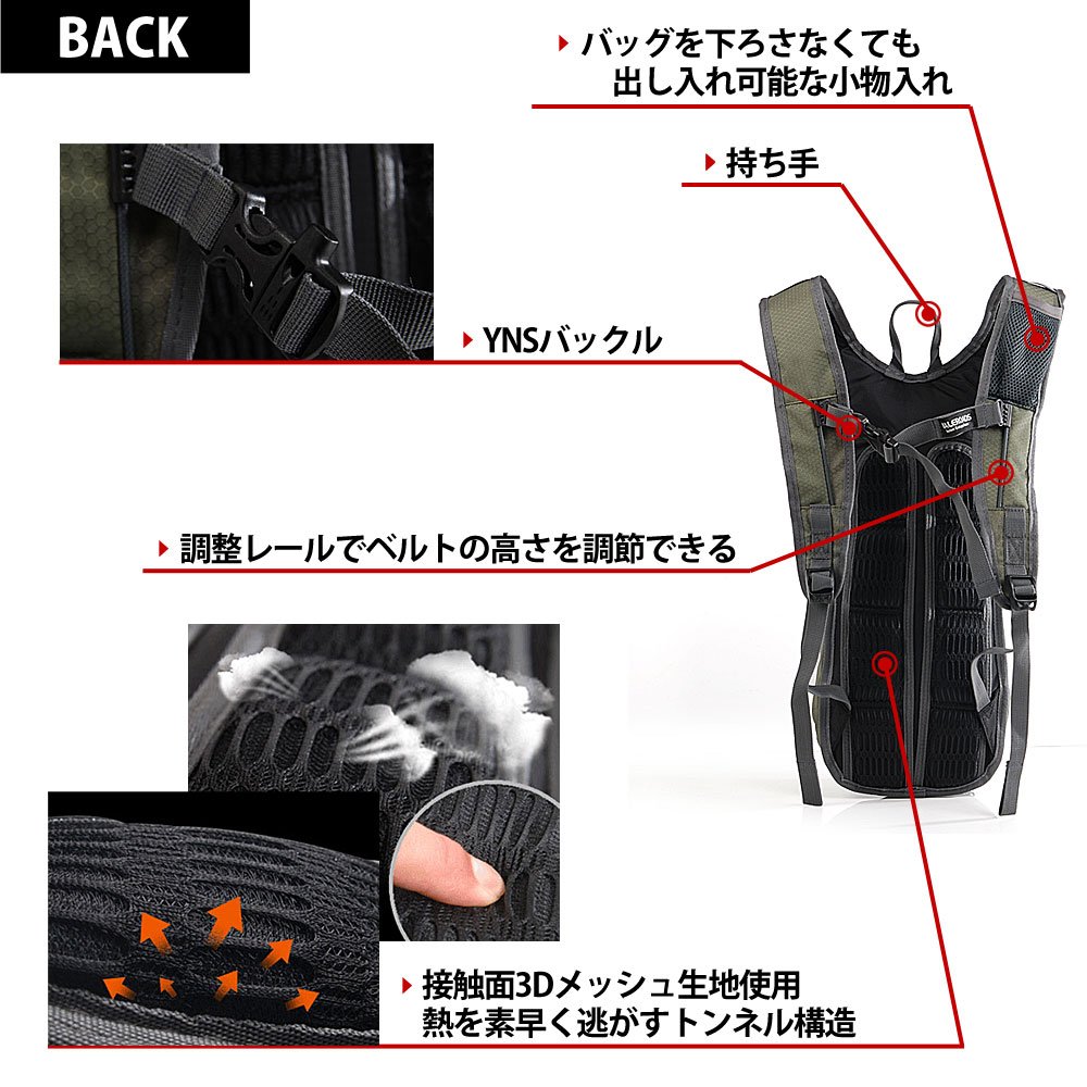Internal pocket: x1 for fixing hydration water pack, x1 for mini umbrella / flashlight x1, with zipper x1, with lid x1, key holder x1